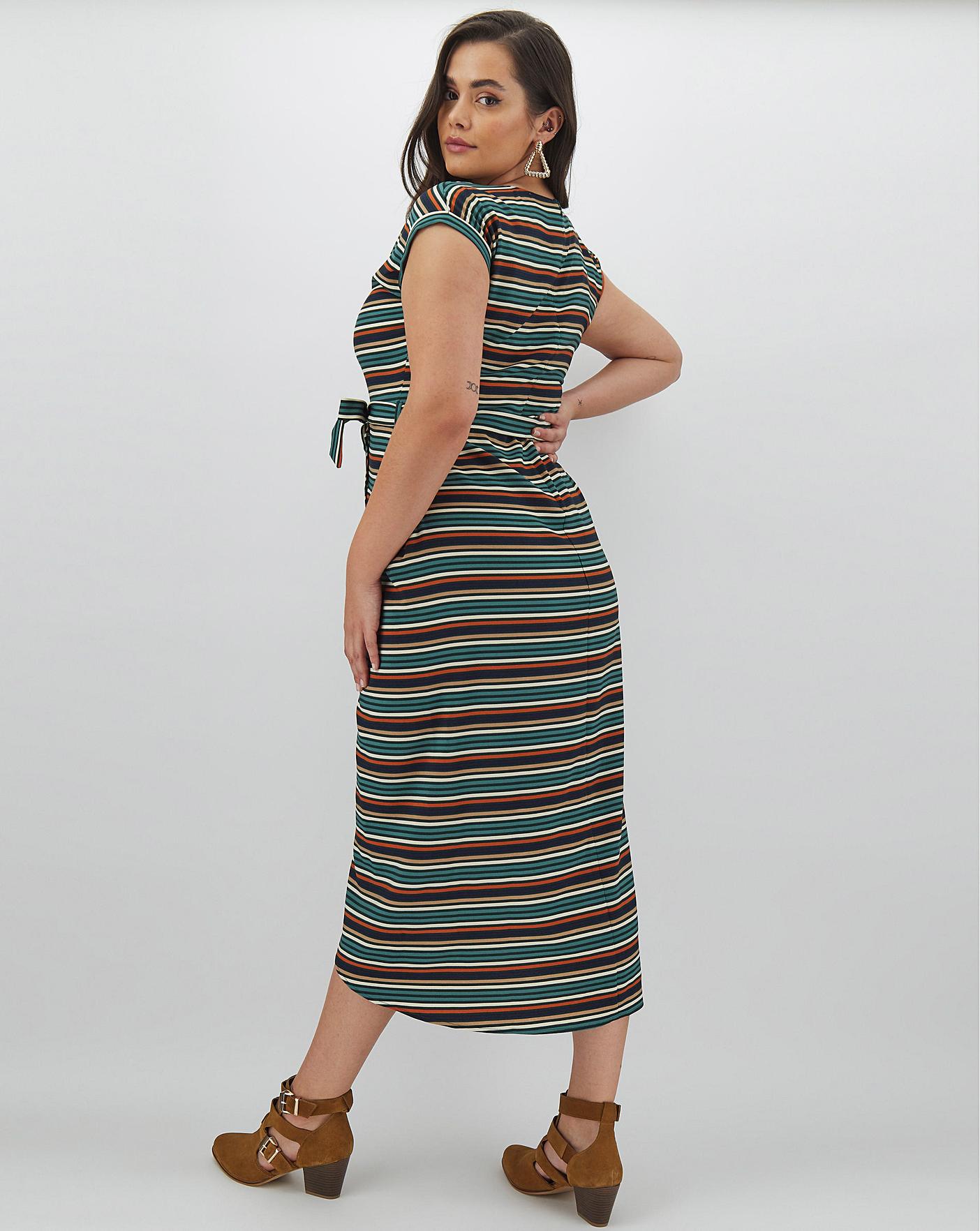 This gorgeous stripe wrap dress by Apricot is a great wardrobe piece for the upcoming months. Featuring a round neckline, short sleeves, wrap-front styling with tie-waist detail, and gorgeous all-over stripe. Add this transitional piece to your wardrobe and style it with a leather jacket for the spring months, and switch to sandals or wedges for summer.