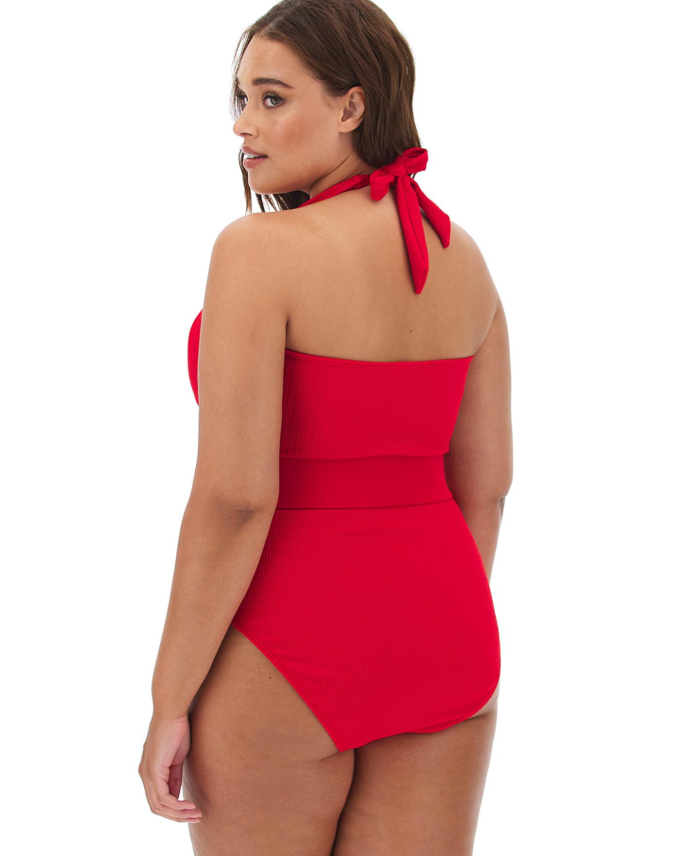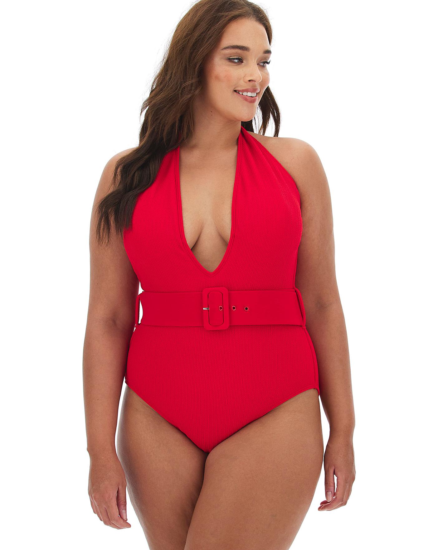 This textured v-neck swimsuit has a plunge neckline and back neck halter straps that can be altered to suit you. In a beautiful bright red, this suit is finished with a thick, functional waist belt to pull you in at the waist and flatter your frame. With lightly-padded removable cups, this non-wired swimsuit is both comfortable and stylish.