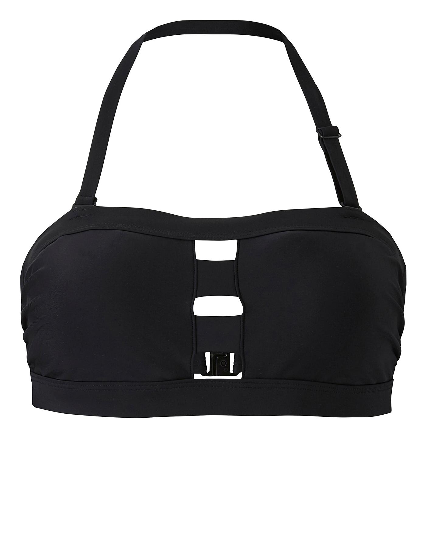 Give your swimwear collection a fresh new look with this gorgeous bandeau bikini top from Simply Yours. A guaranteed head-turner, this bikini top will transform you into the ultimate beach babe from the moment you put it on. With cut out, strap detailing to the centre front and halterneck-style strap, this piece promises a flattering finish, lifting your bust and drawing attention to your cleavage. The classic black adds a feminine touch whilst the clasp-style back promises to hold you firmly in place.