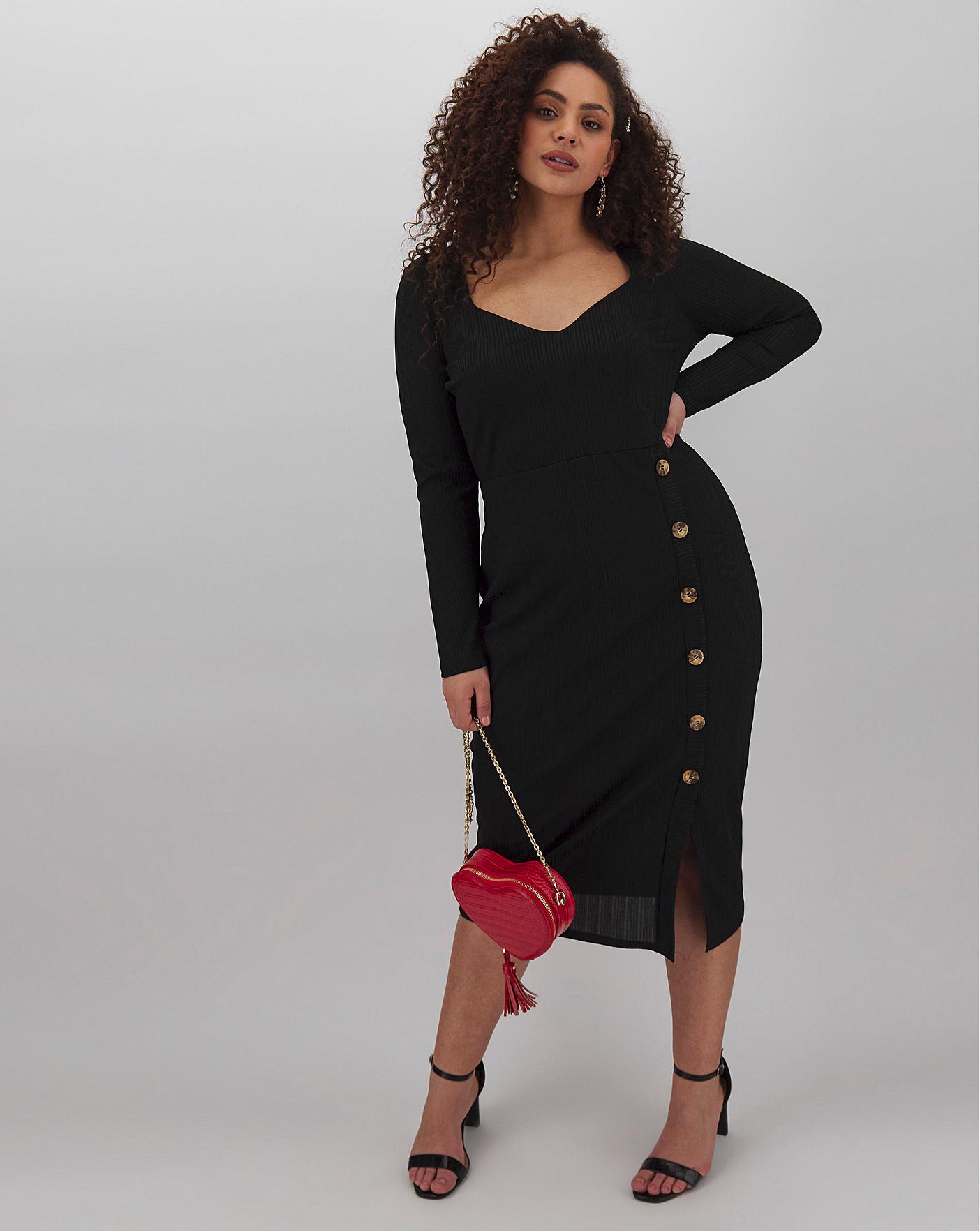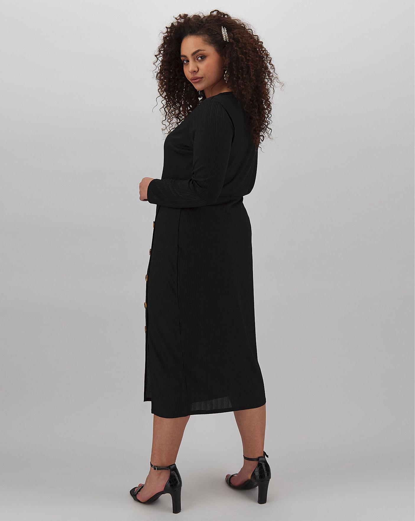 Comfortable yet so on trend - this ribbed dress with the fixed button down detail can be dressed up or down. Perfect for brunch to bar - pair this black dress with trainers, heeled ankle boots or even strappy heels.
