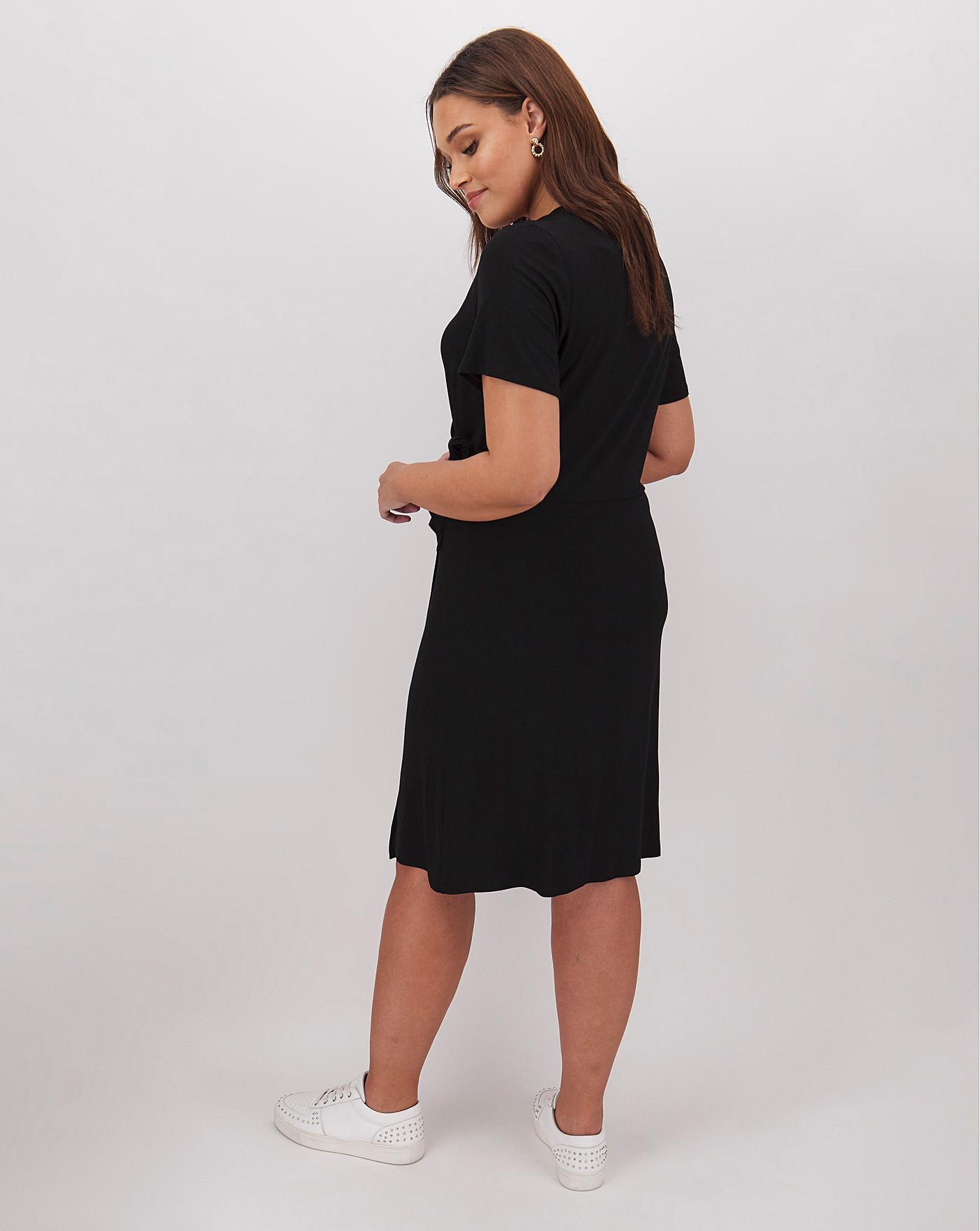 The classic wardrobe winning tea dress has been updated for the new season. This knee length tea dress features O-Ring neck detailing and is in classic all black. Complete this chic look with some cute wedges or boots and you'll be ready to go enjoy your day in style.