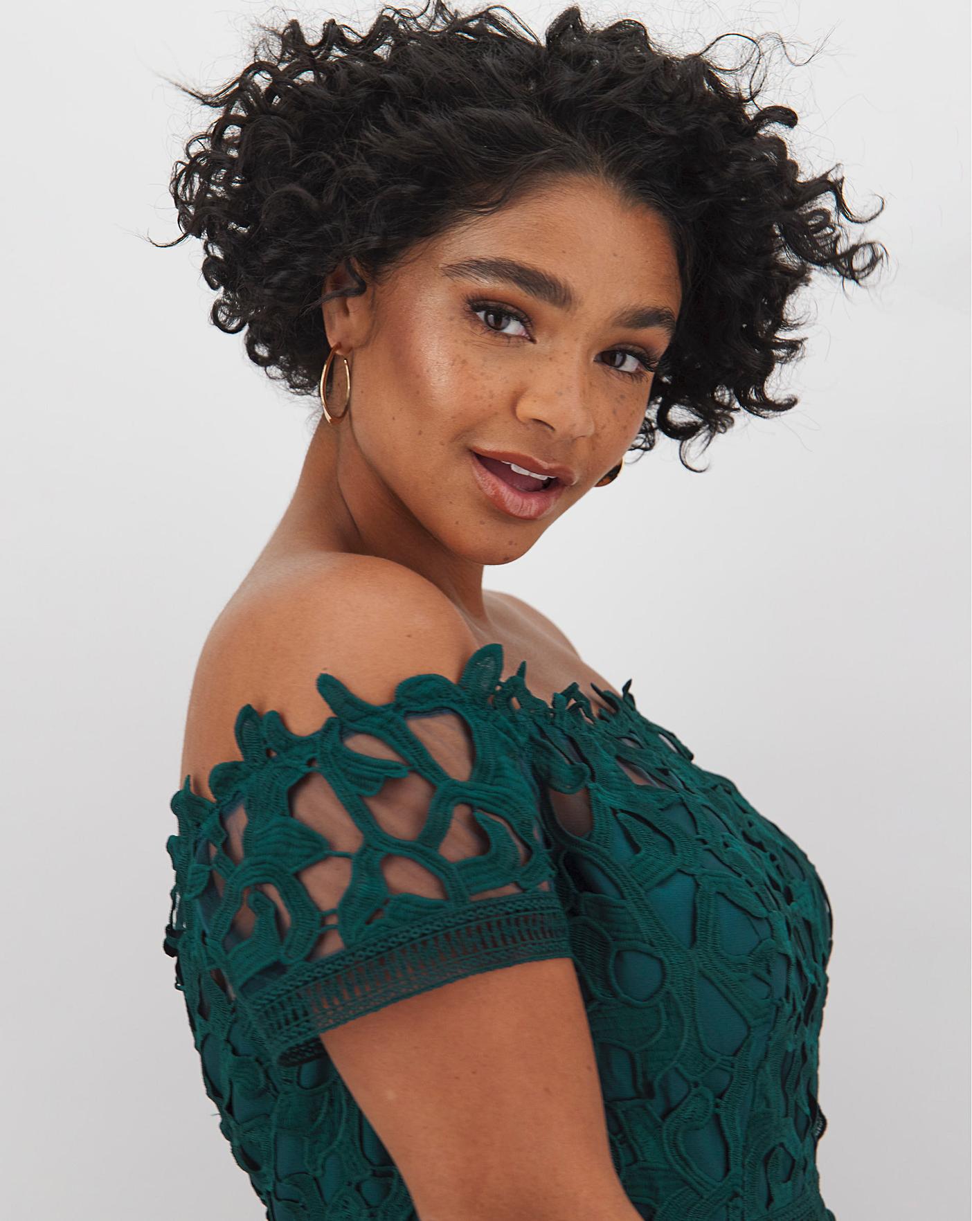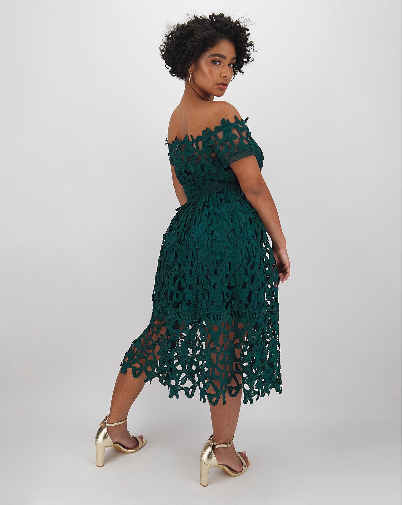 Treat yourself to this gorgeous crochet lace dress by Chi Chi. Featuring a flattering bardot neckline with shorter lining panel, in the on-trend green colour for the season. Style with strapped heels for the perfect occasion.