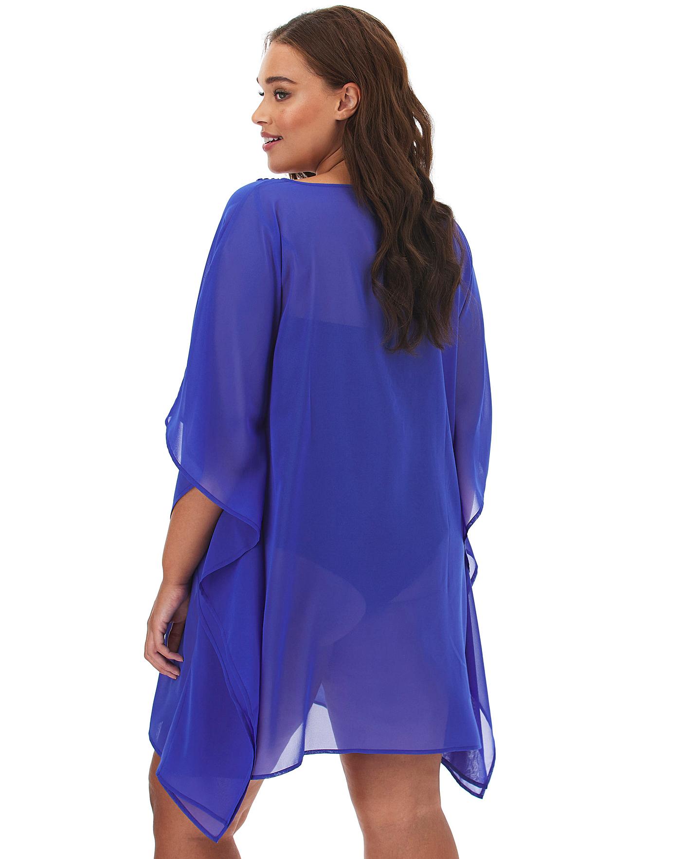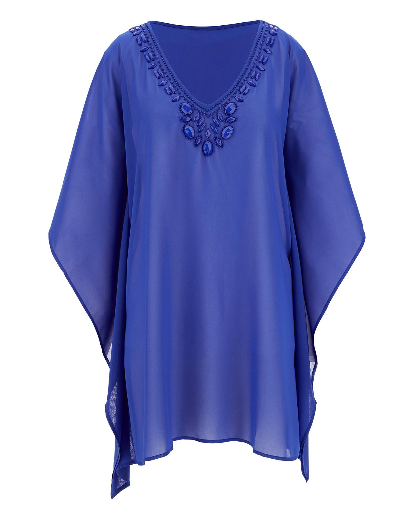 Add a touch of glamour and sparkle to your holiday wardrobe with this embellished beach kaftan. In a beautiful blue floaty fabric with beaded-neckline detail, this will be your new favourite piece. A short kaftan which is perfect for throwing on and is super easy to wear. Pair with your favourite beachwear from the collection and you'll be beach-ready!