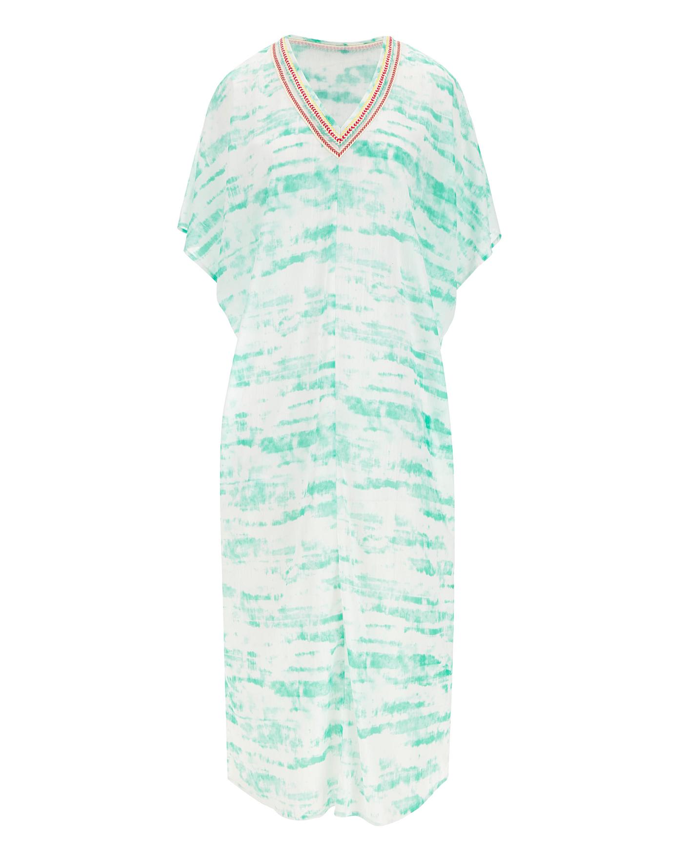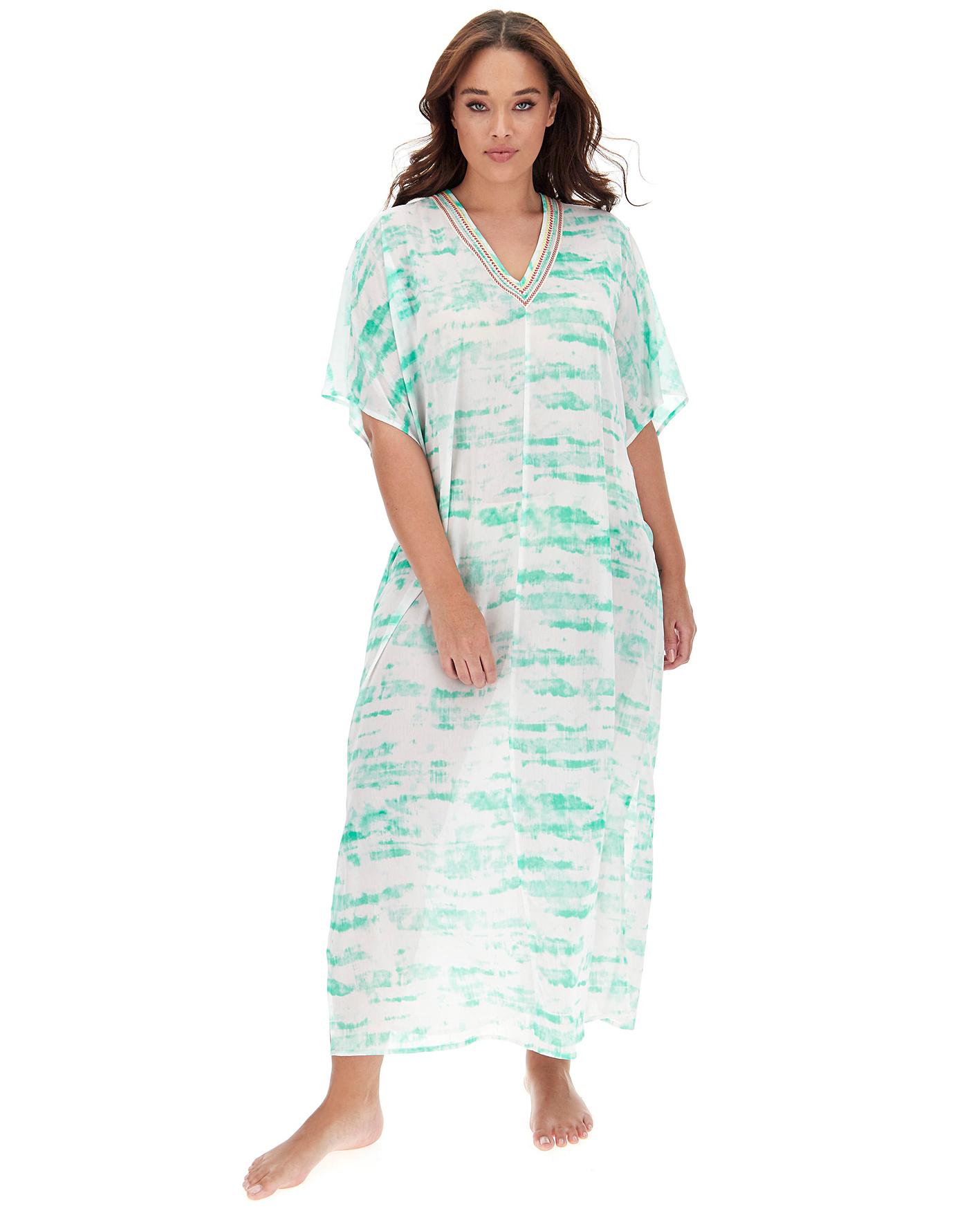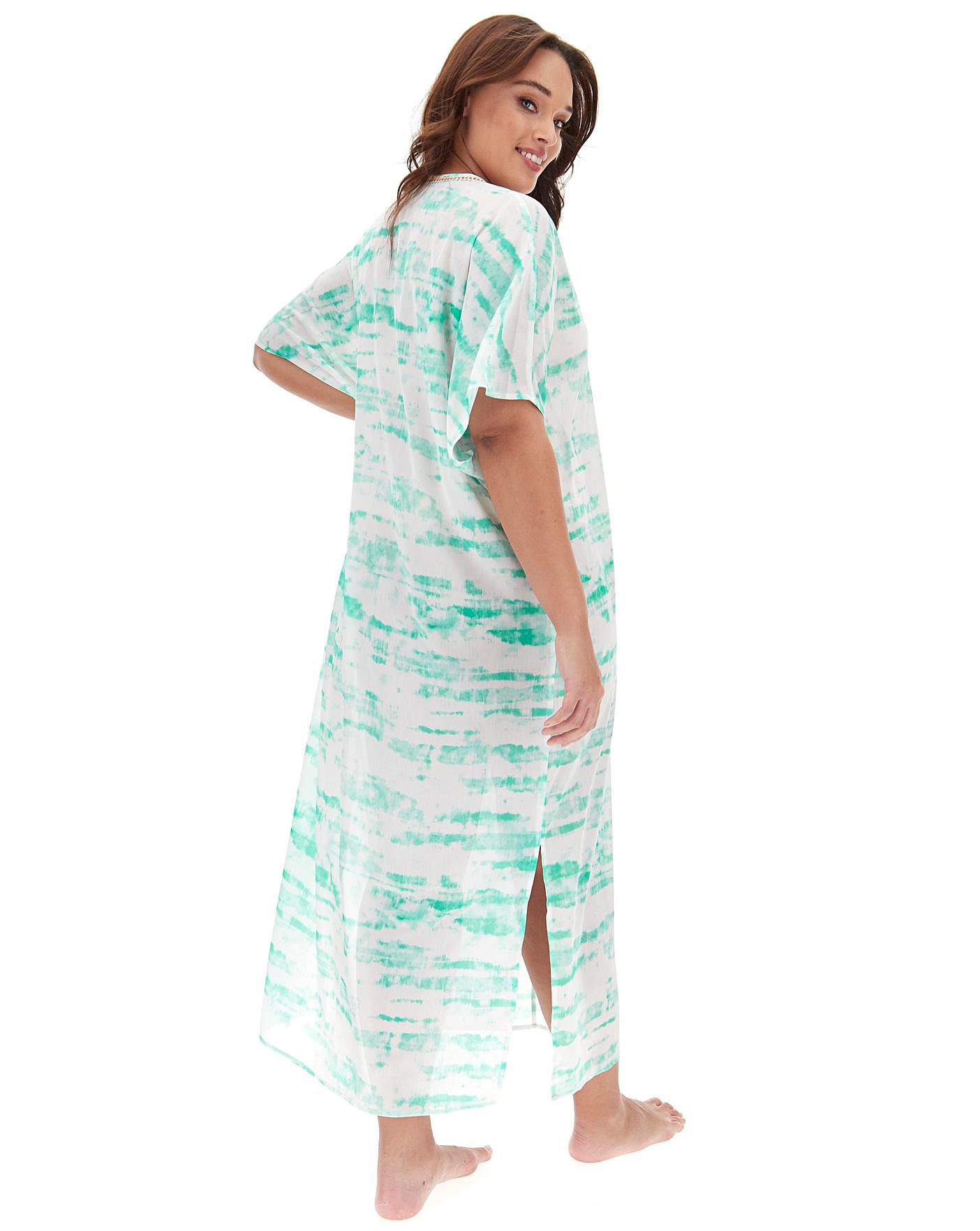 This tie dye print embroidered kaftan is excellent for throwing on over your swimwear. In a maxi length and loose fit with side splits detail, this is lovely and breezy to keep cool in the heat. Finished with embroidered neckline detail.