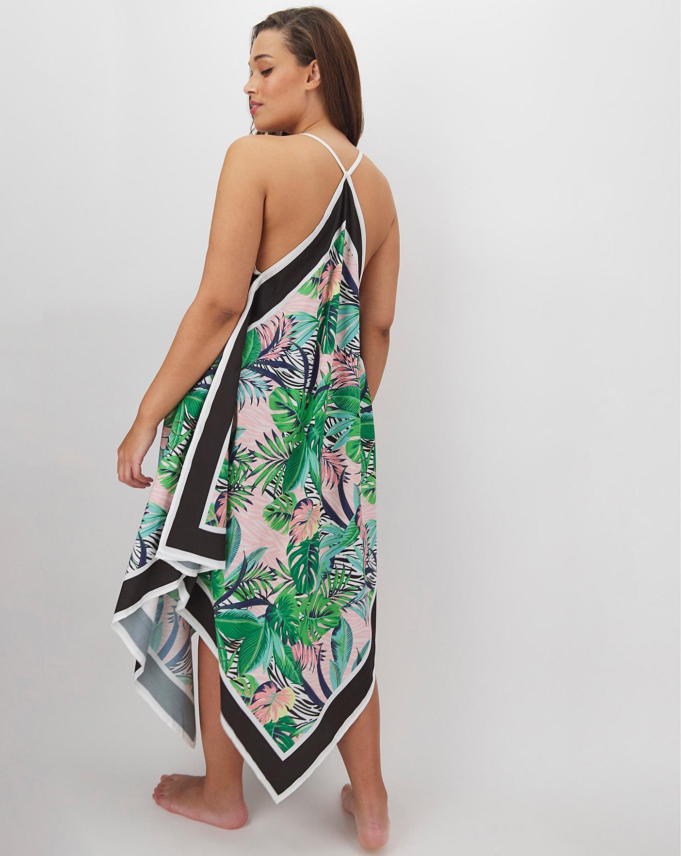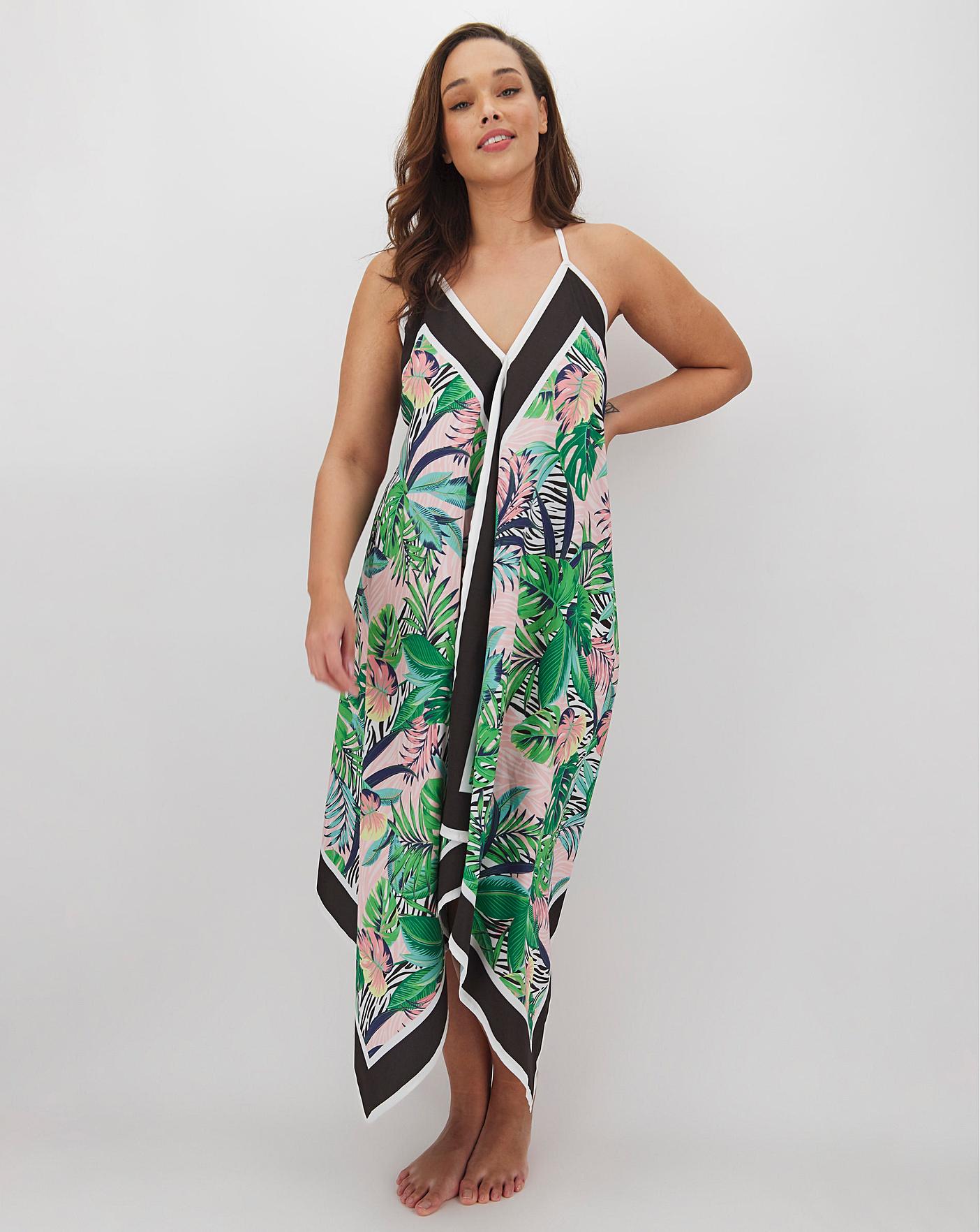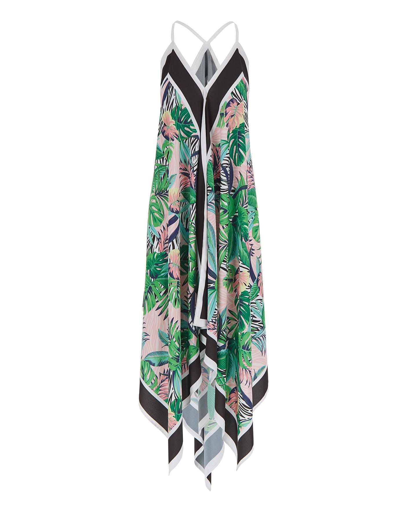This hanky hem beach dress in all-over palm and animal print will be a favourite. The perfect piece to throw on over your swimwear, the cami straps and loose design of this playsuit will be great for keeping you cool and comfortable. You won't forget this one on your next beach trip!