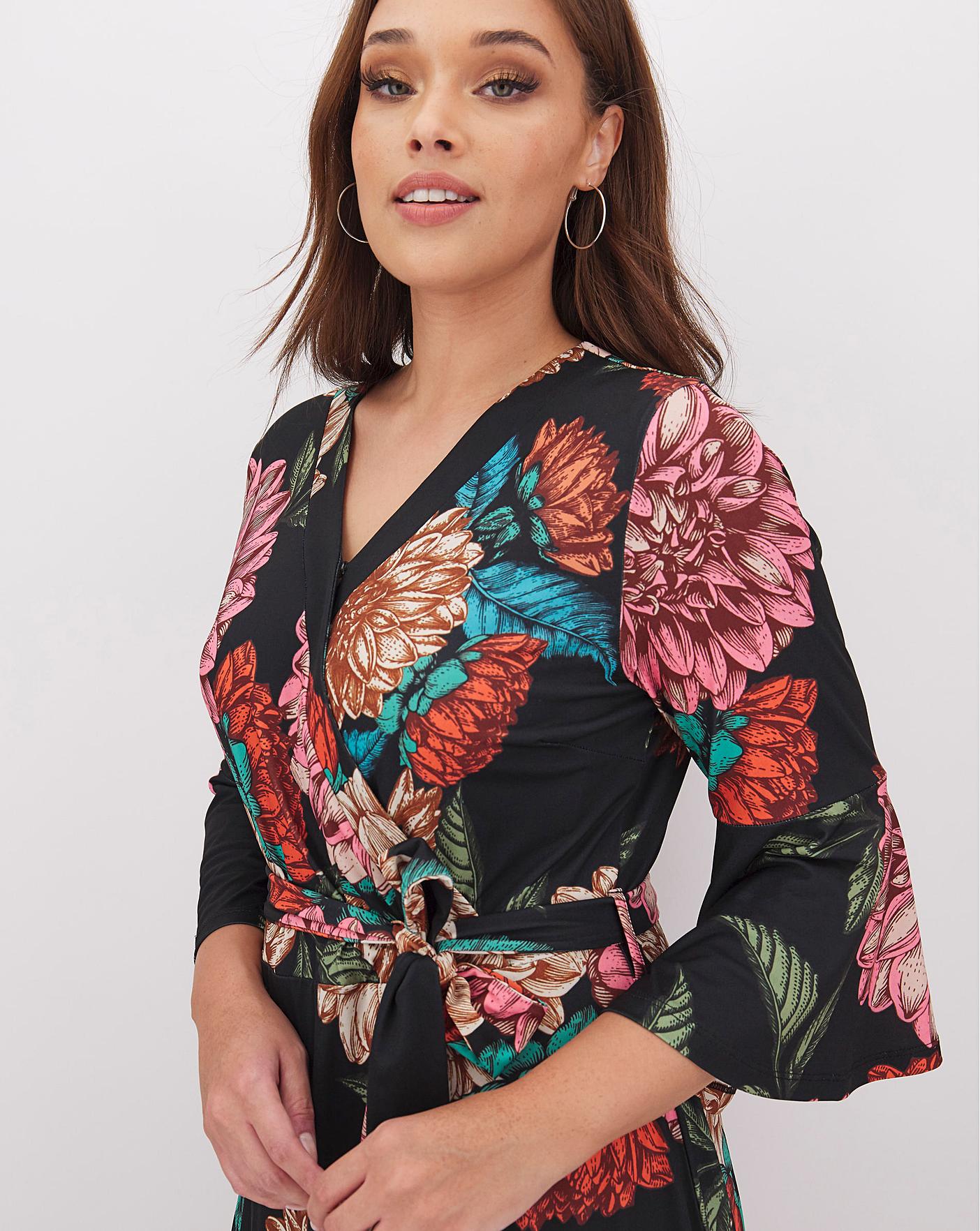Exclusive to us - Joanna Hope. This print maxi dress is a fabulous wrap body style that will take you from day to night. This dress fits and flatters in all the right places. With self-tie belt and three-quarter sleeves.