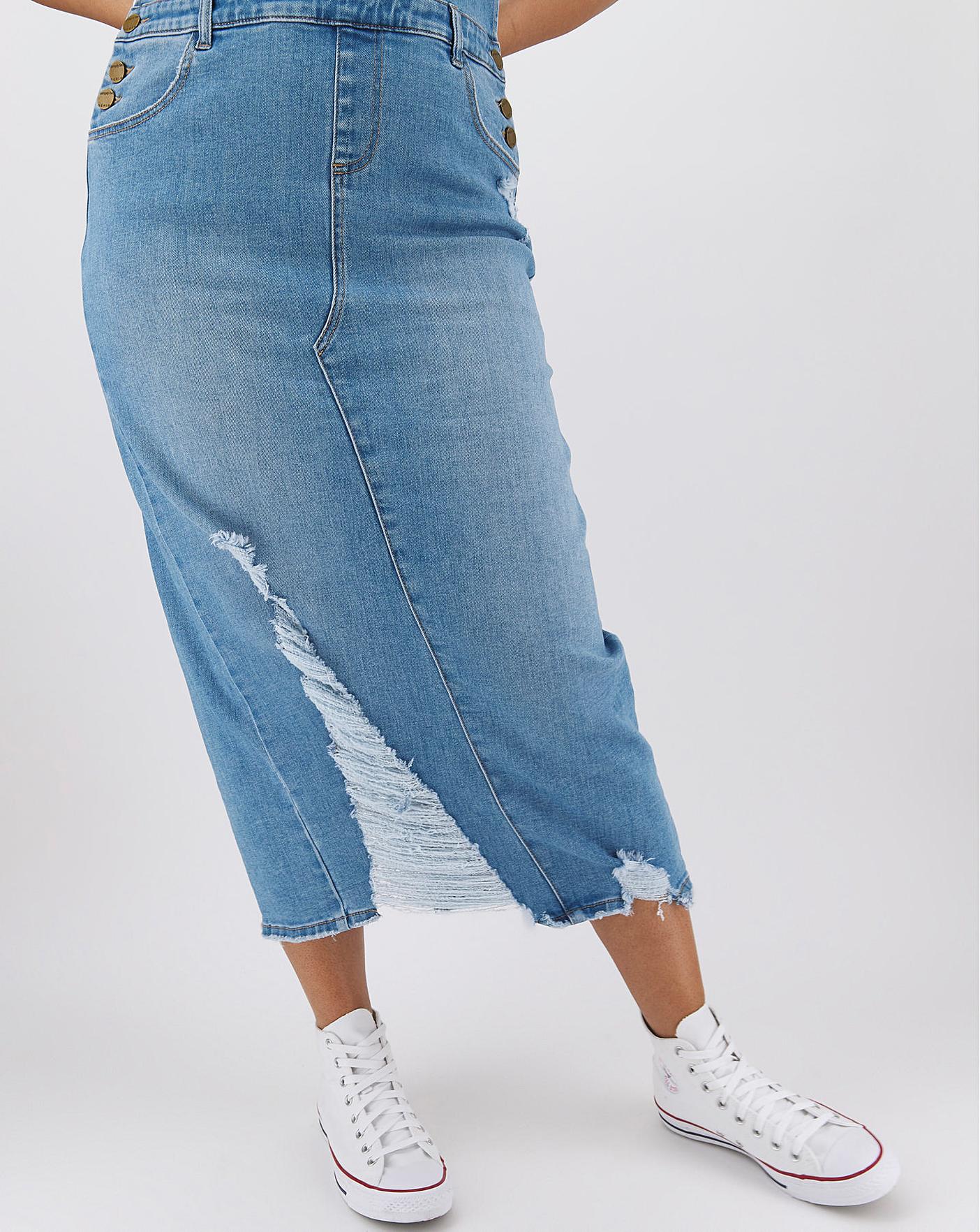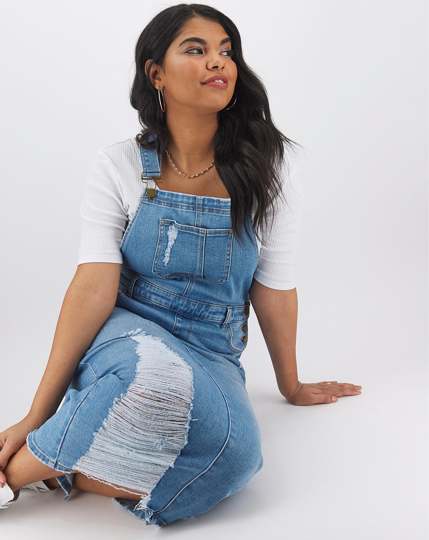 A fresh new update on one of last season’s best sellers, this ripped maxi dungaree now features stylish distressed detailing. Still in the same super stretchy denim fabric, this is a true must have for your wardrobe!