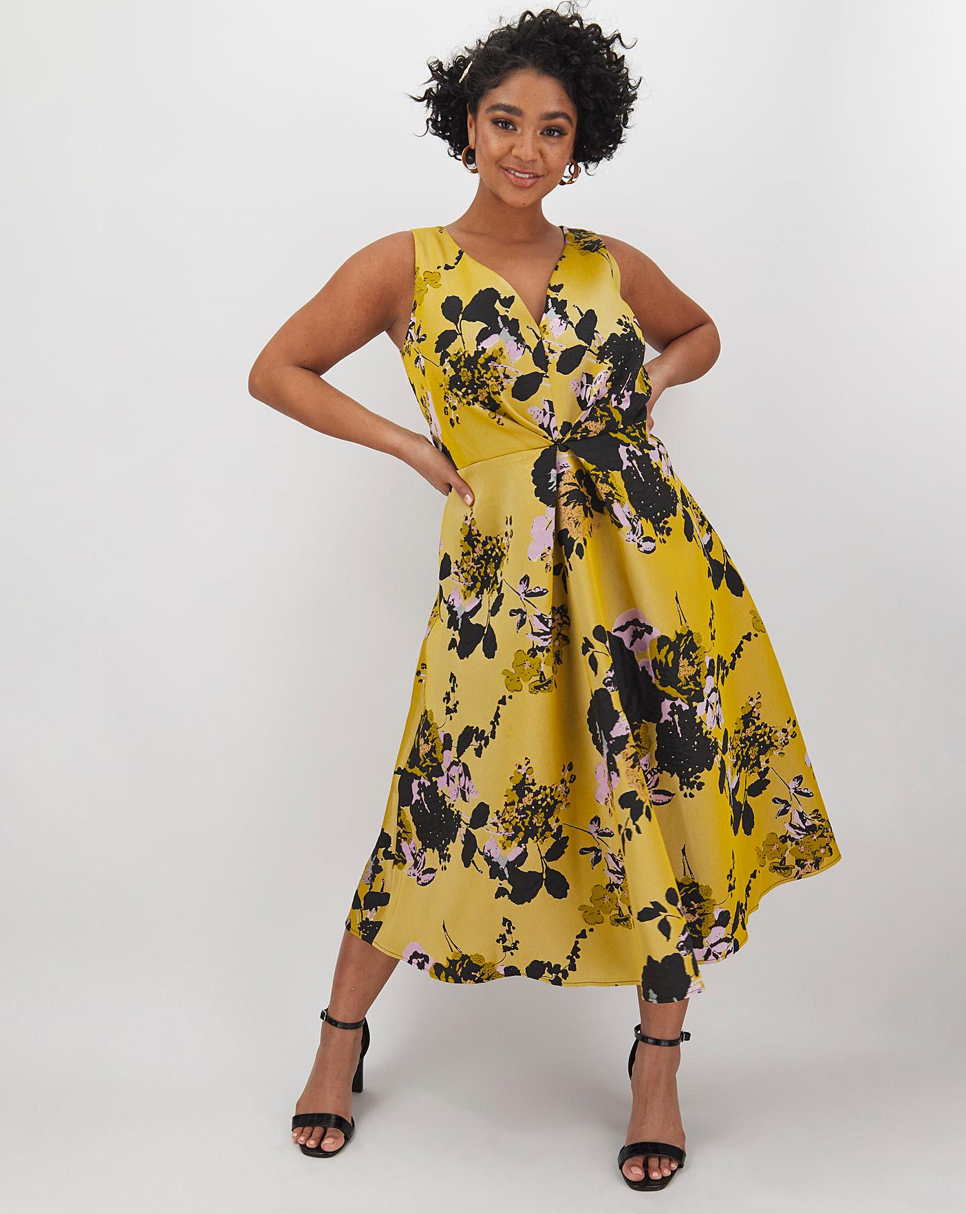 This stunning yellow floral dress by Little Mistress is both flattering and striking. With a V-neckline and twist-effect front, this fit-and-flare midi dress accentuates your curves. The perfect dress for a summer wedding, whether it be for your bold and beautiful bridesmaids or as a wedding guest.