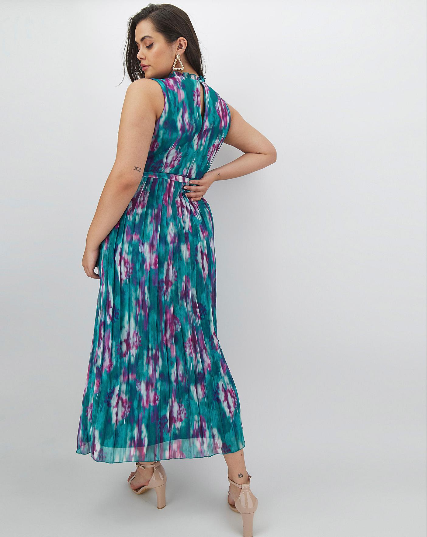 In a tie-dye floral effect print, this Little Mistress midi dress has a round neck with frill detail and a pleated skirt. A gorgeous dress for special occasions, whether it be for a wedding or a summer garden party.
