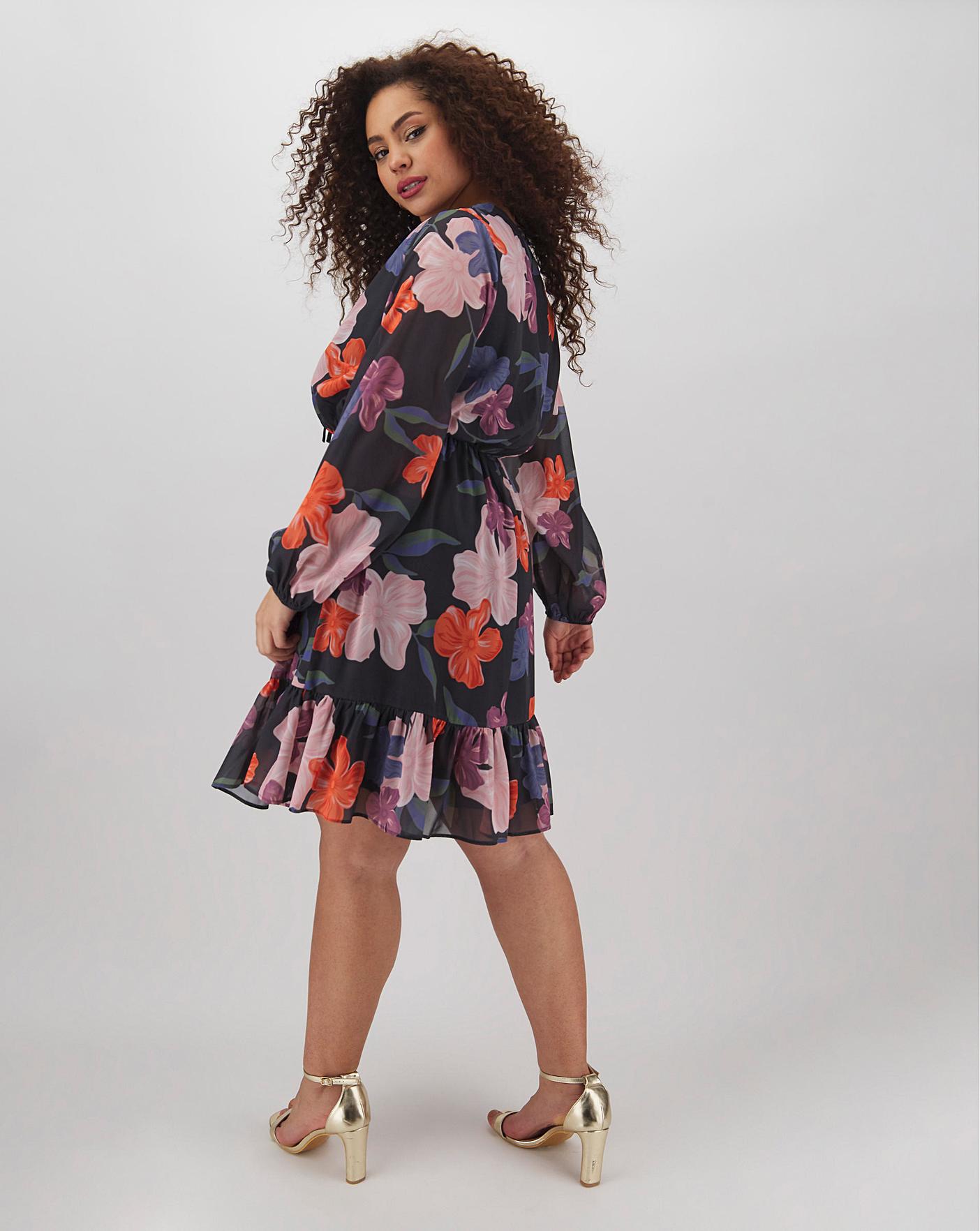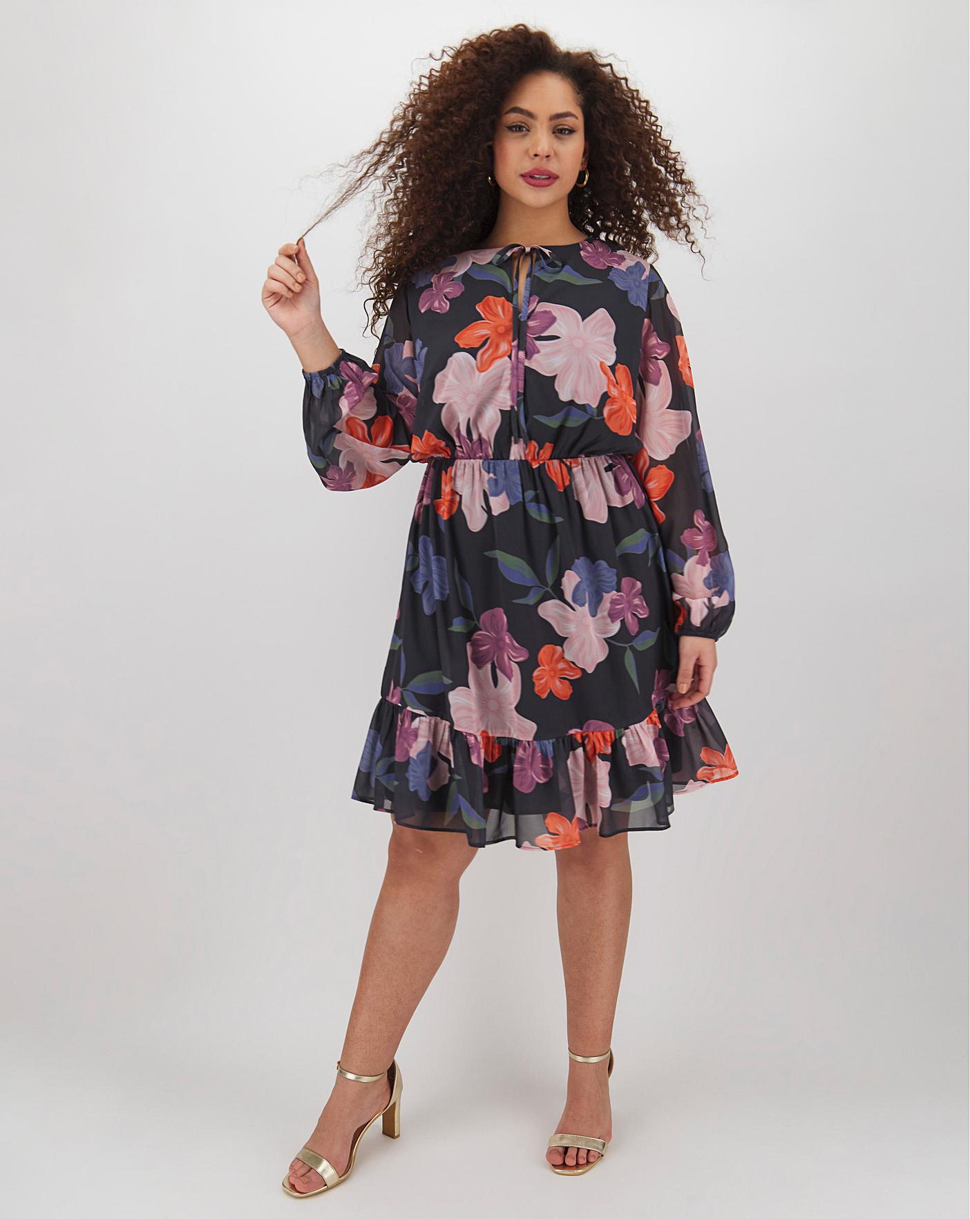 This gorgeous Lovedrobe floral print dress features a tie neck and a ruffle hem. Wear this long-sleeved skater dress with heels and accessories.
