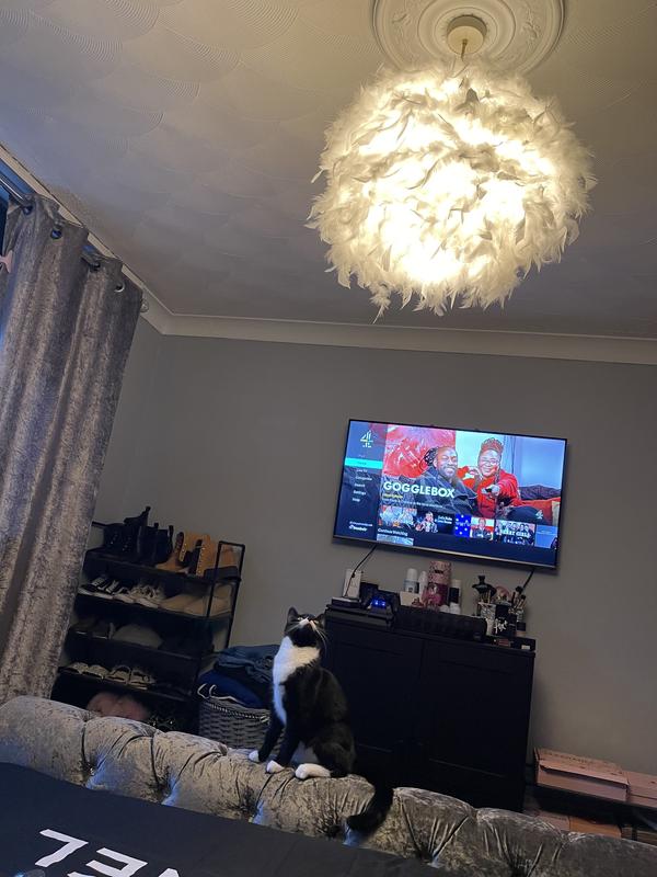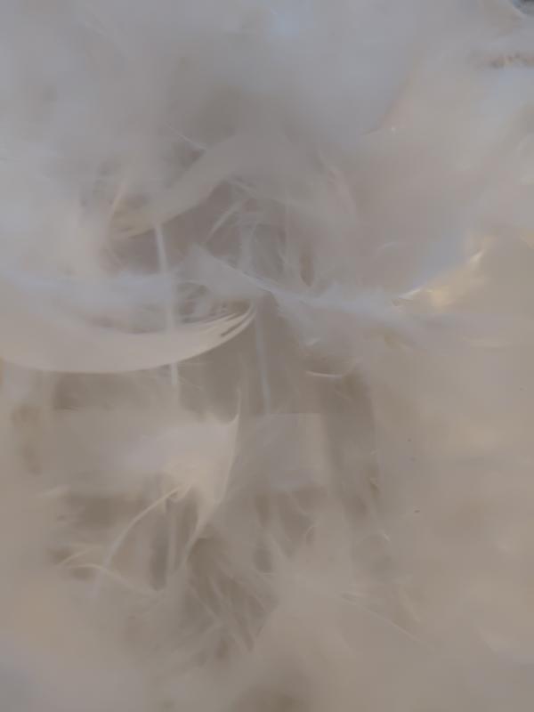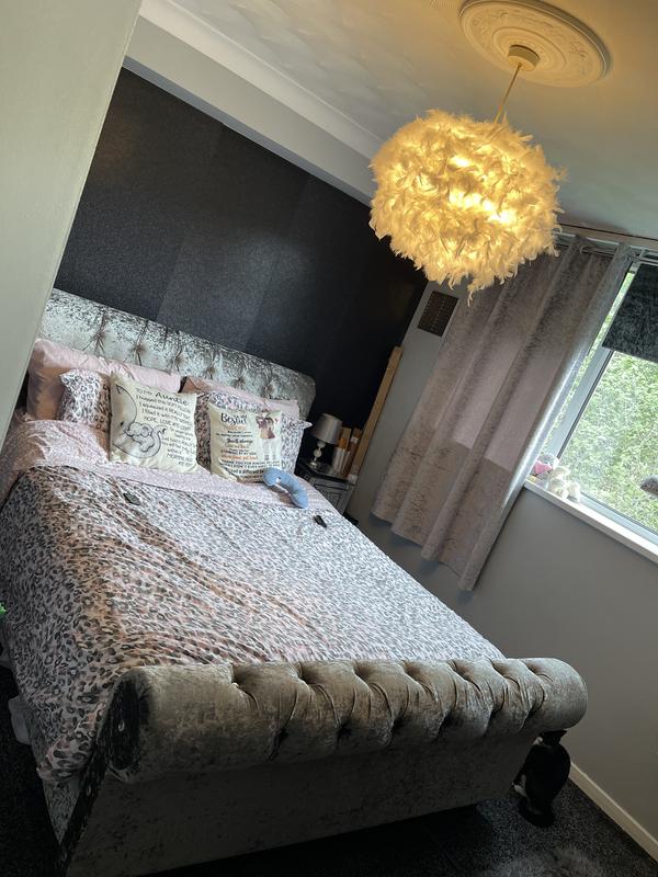 What a great light shade,really unusual design made of white feathers good size and really well made. It hangs in my granddaughter...