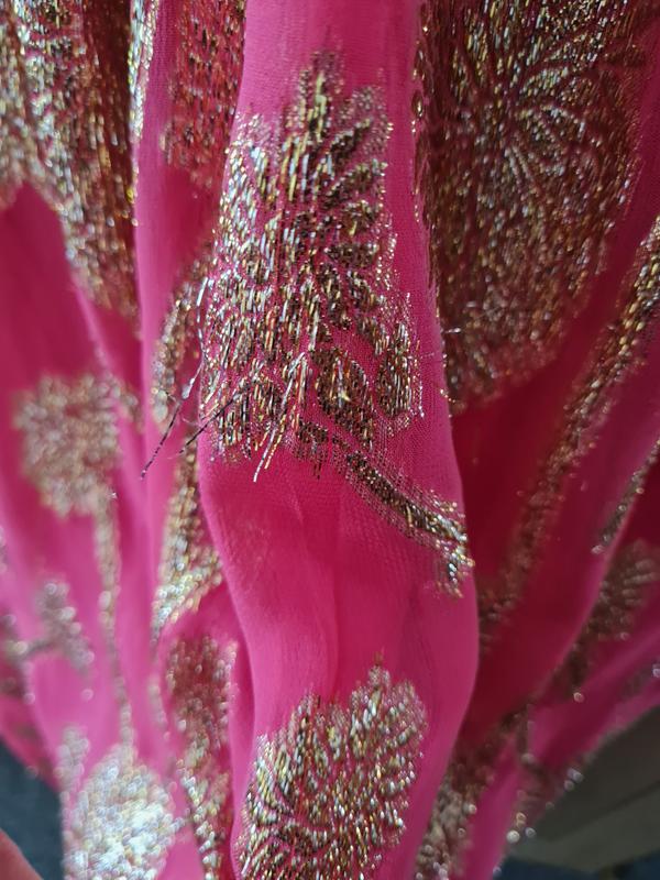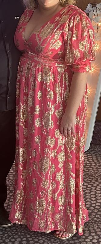 This dress is absolutely stunning. The pink is vibrant and the gold detail in the pattern really shimmers. The fitting is perfect!...We are committed to authentic customer feedback on our products. Our reviews are moderated and verified as authentic by our independent third party, Bazaarvoice.