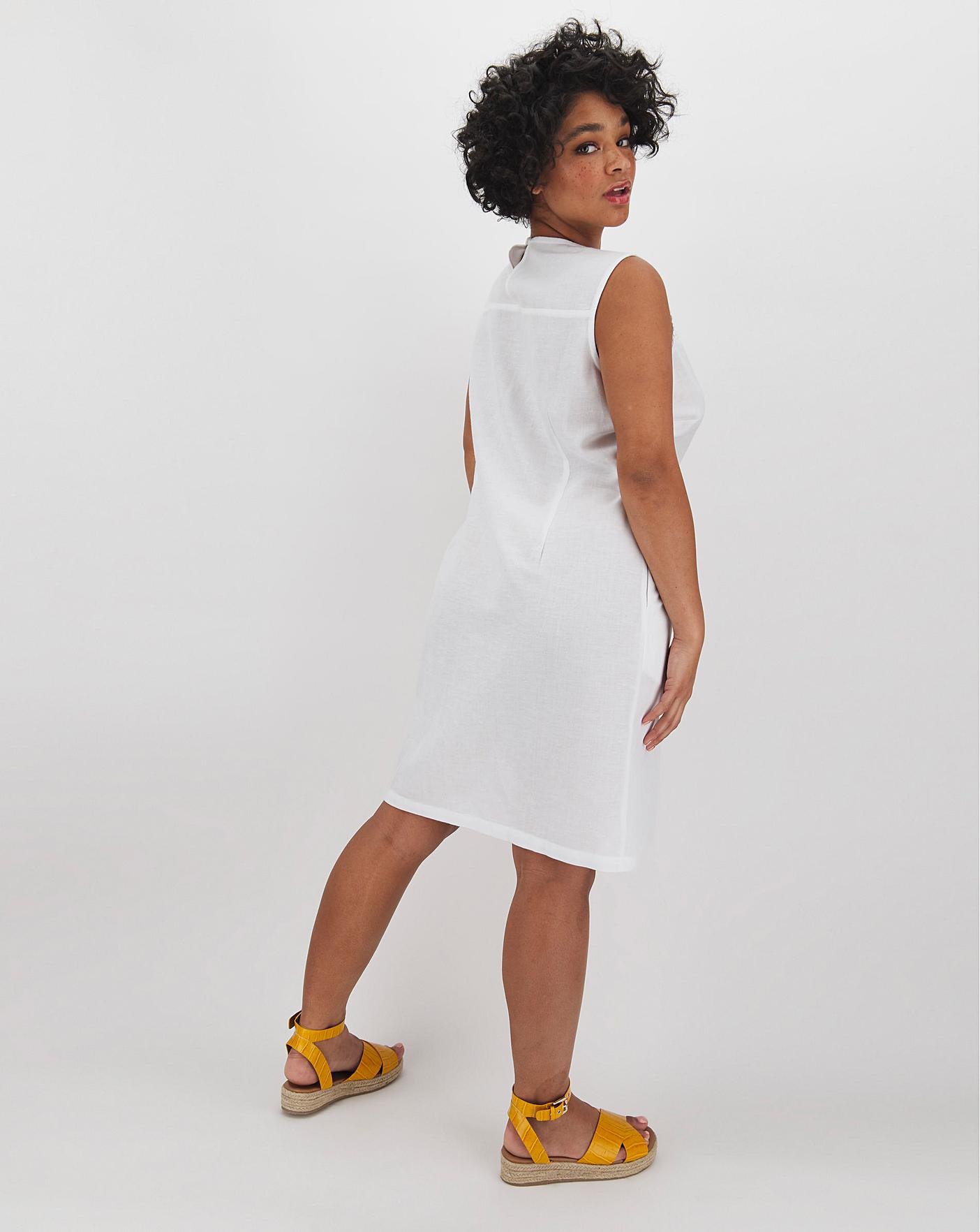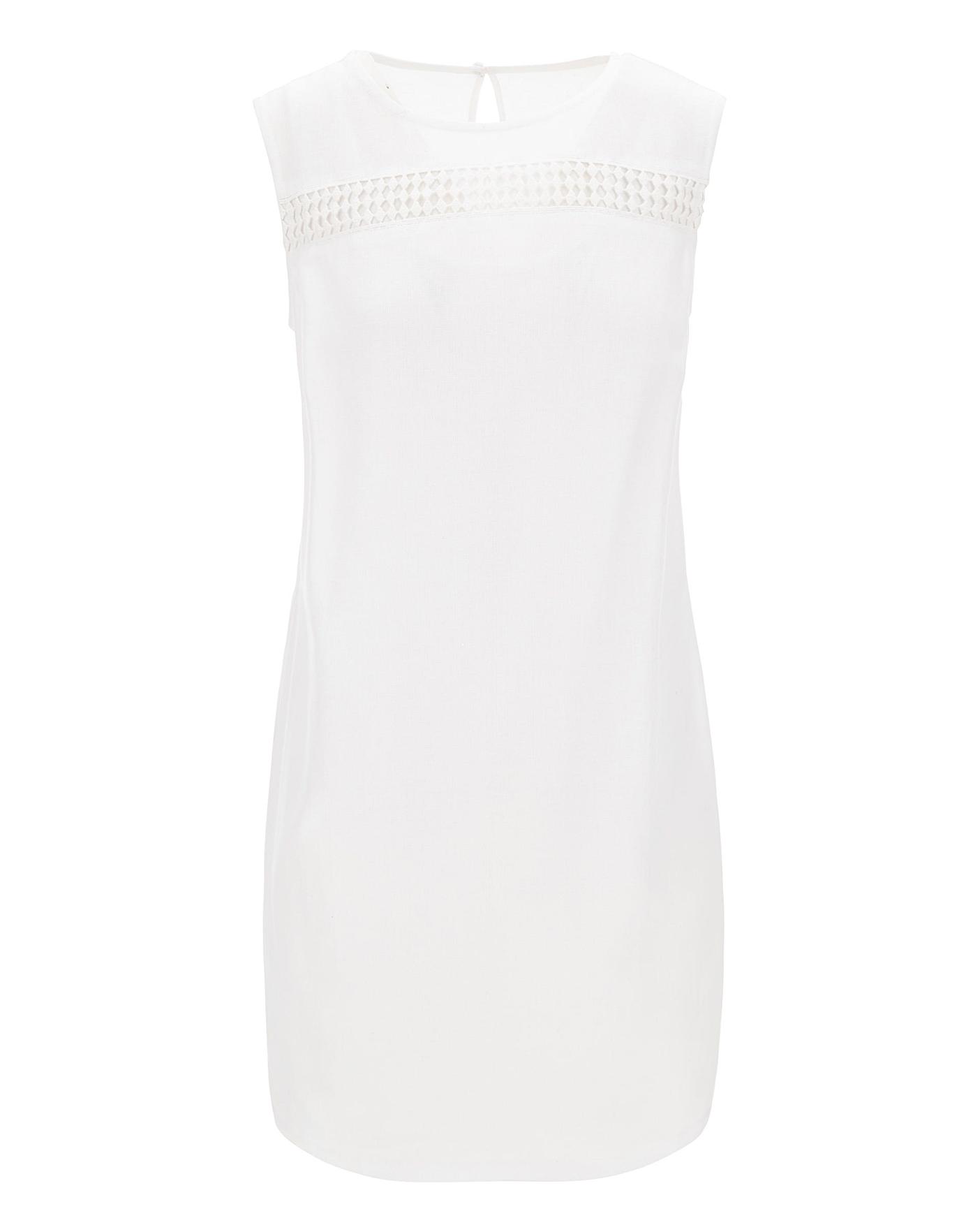 Our best-selling linen shift dress has been updated with crochet detailing across the neckline and two side pockets. This sleeveless holiday staple is designed in a flattering loose shift style to suit any body shape. Featuring back neck keyhole button fastening, team with your favourite sandals for the perfect holiday look.